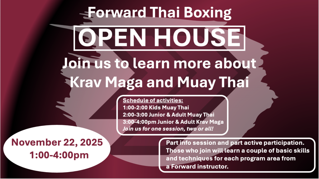 Join Forward Thai Boxing for an Open House. You are invited to Forward to learn more about our martial arts and class structure, and meet the instructors and students.