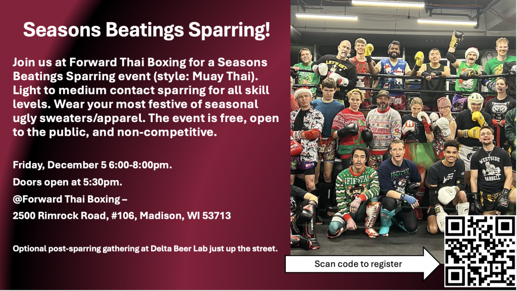 Join us at Forward Thai Boxing for a Seasons Beatings Sparring event (style: Muay Thai). Light to medium contact sparring for all skill levels. Wear your most festive of seasonal ugly sweaters/apparel. The event is free, open to the public, and non-competitive.